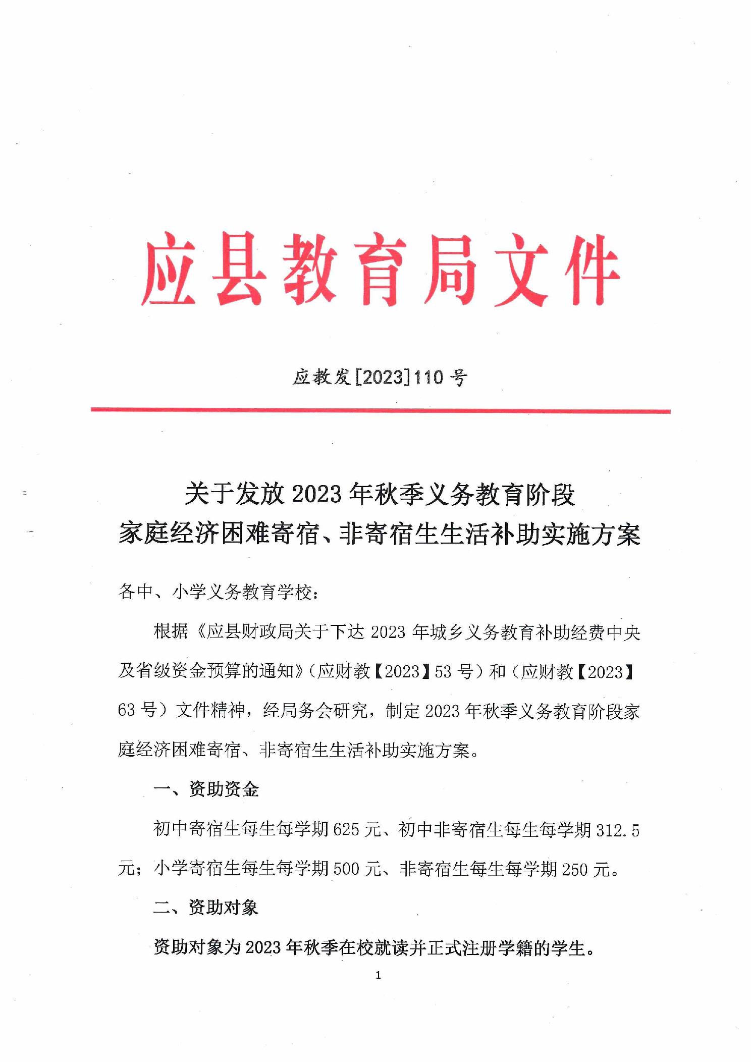 關于發放2023年秋季義務教育階段家庭經濟困難寄宿、非寄宿生生活補助實施方案